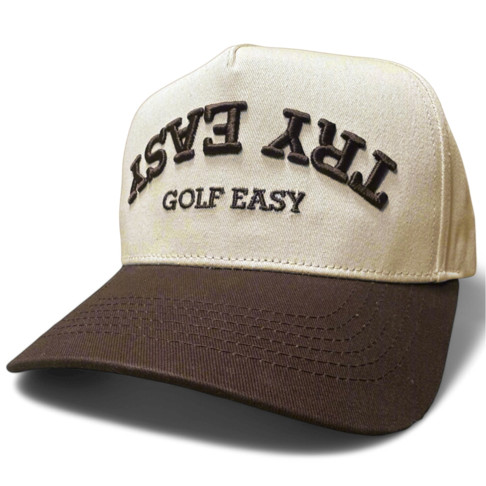 Two tone brown and cream snapback golf hat with 3D embroidery. Try easy, golf easy. It’s that simple. Channel those Big Easy vibes out on the golf course. A good round of golf starts with looking good and feeling good out there. This hat will definitely have you feeling extra fresh on that tee box.